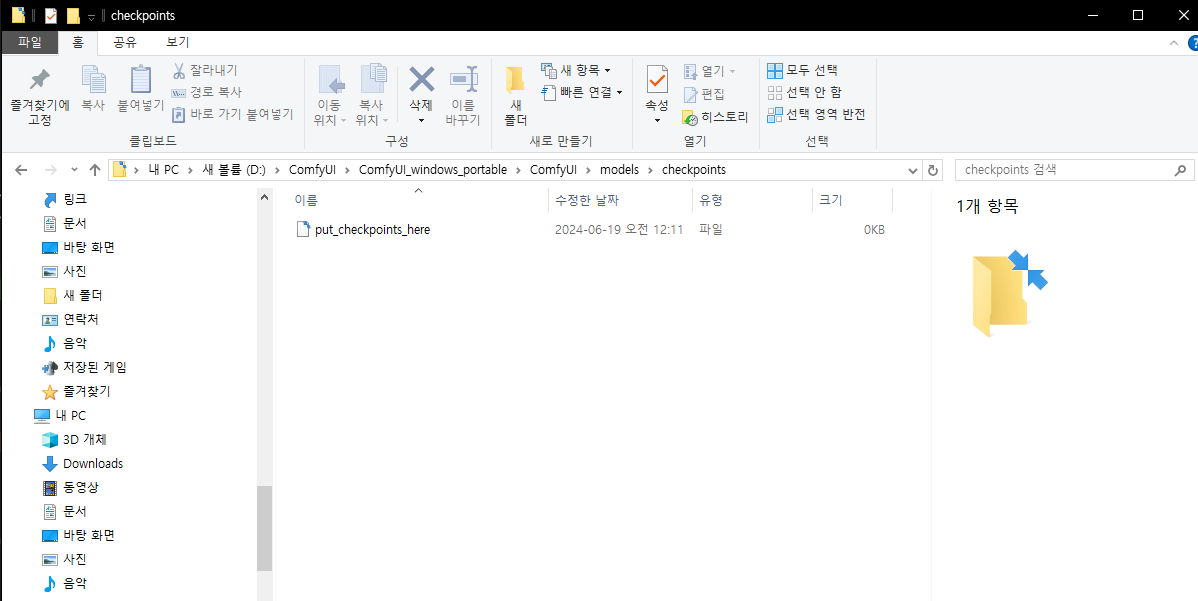 준비가 되었다면 ComfyUI\ComfyUI_windows_portable\ComfyUI\models\checkpoints 에 넣어주면 된다.